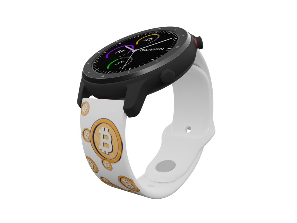 Bílý náhradní řemínek s potiskem bitcoinu, což je skvělá volba pro všechny fanoušky kryptoměn.
