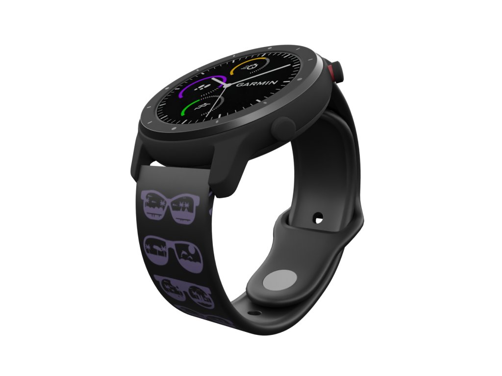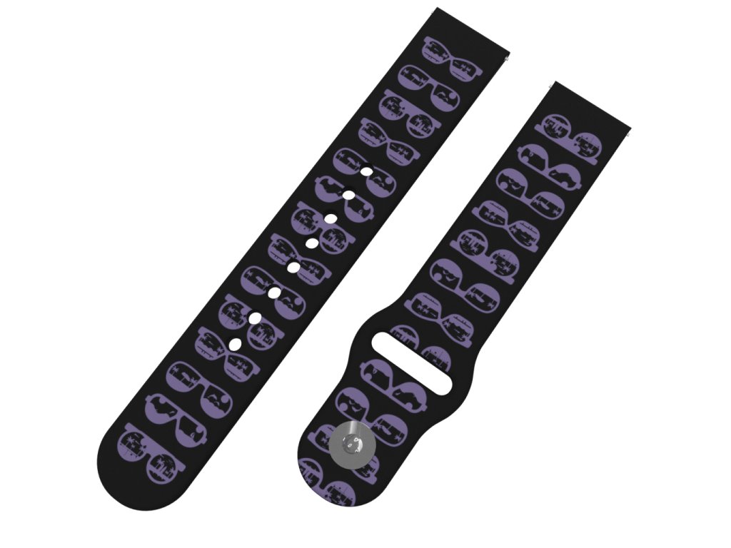 Černý náhradní řemínek s potiskem fialových slunečních brýlí ve kterých ještě zůstaly odlesky letní dovolené.