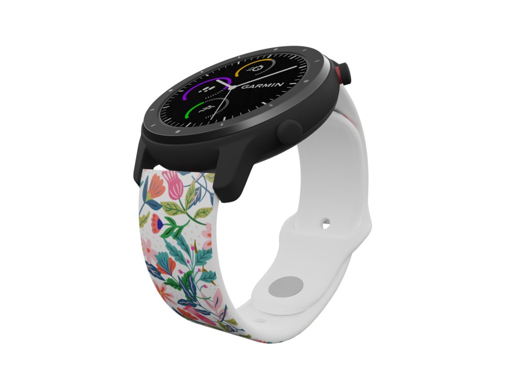 Bílý řemínek s výraznou barevnou grafikou nespoutané džungle. Spousta rostlin, květin a barev,
