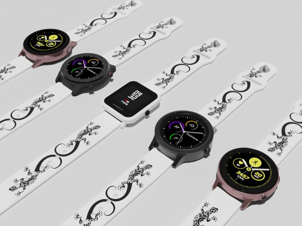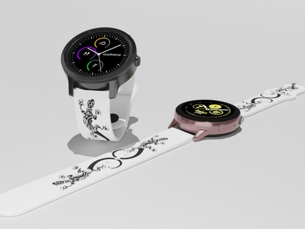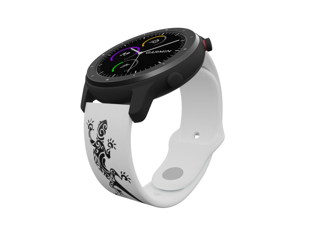 Bílý náhradní řemínek pro chytré hodinky s černým potiskem tribalových ještěrek.