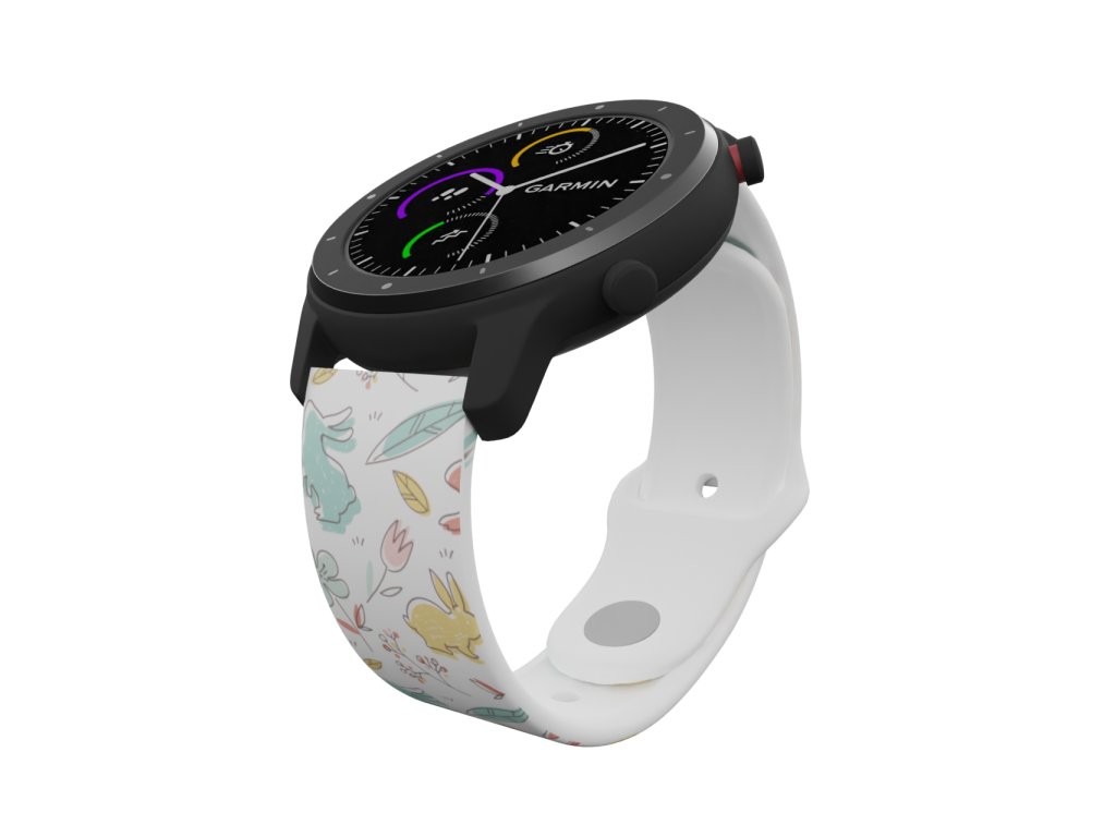 Bílý náhradní řemínek pro chytré hodinky s potiskem prvků Velikonoc v jarních pastelových barvách.
