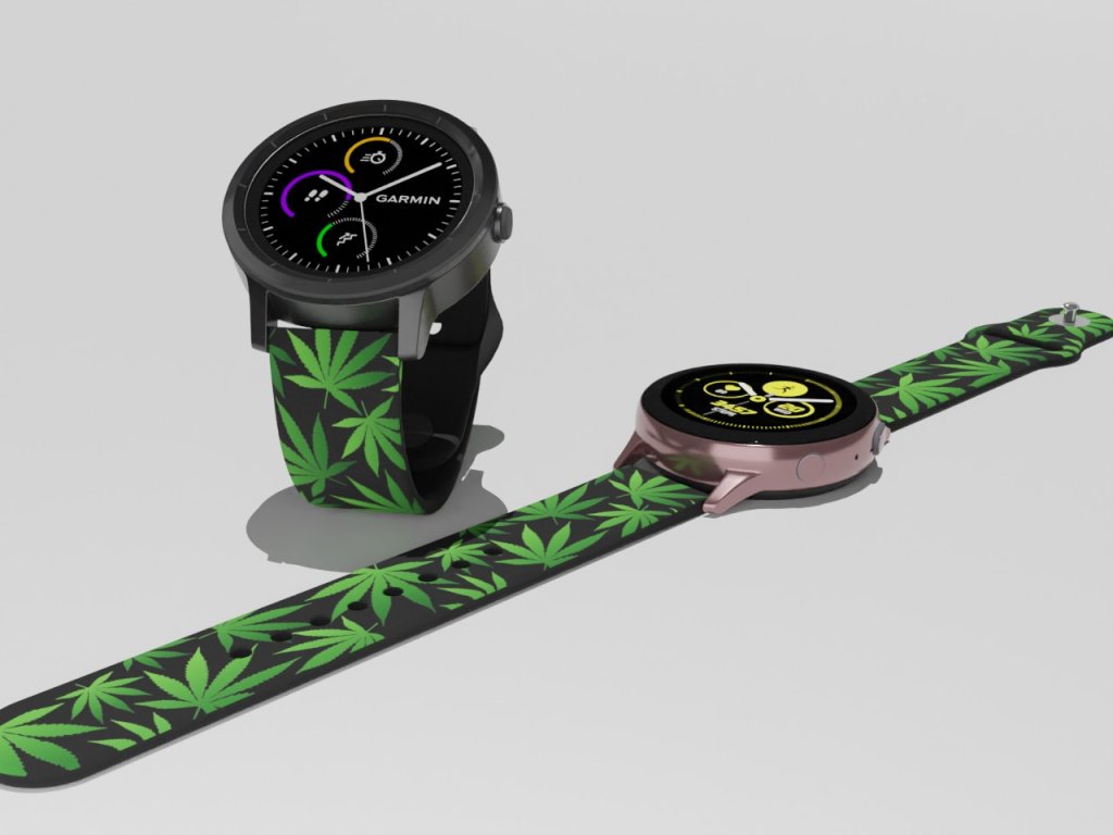 Bílý náhradní řemínek pro chytré hodinky se zeleným potiskem listů marihuany.
