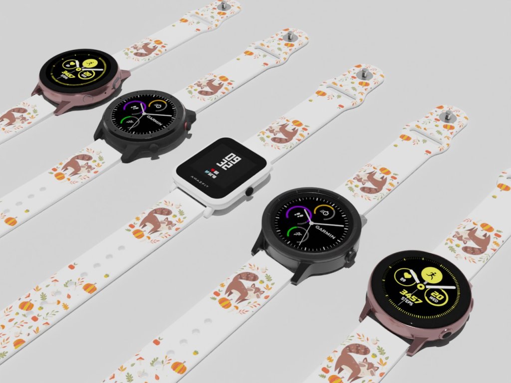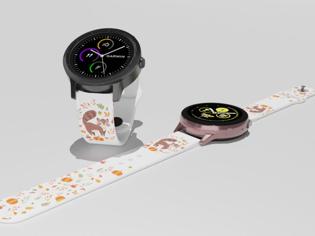 Bílý náhradní řemínek pro chytré hodinky s podzimním potiskem s mývalem.