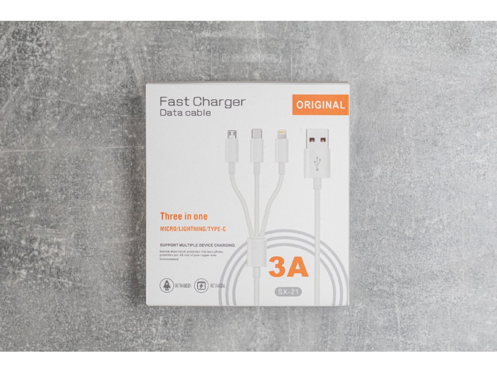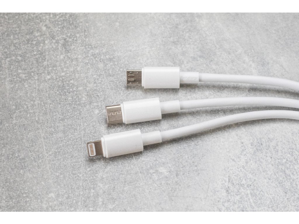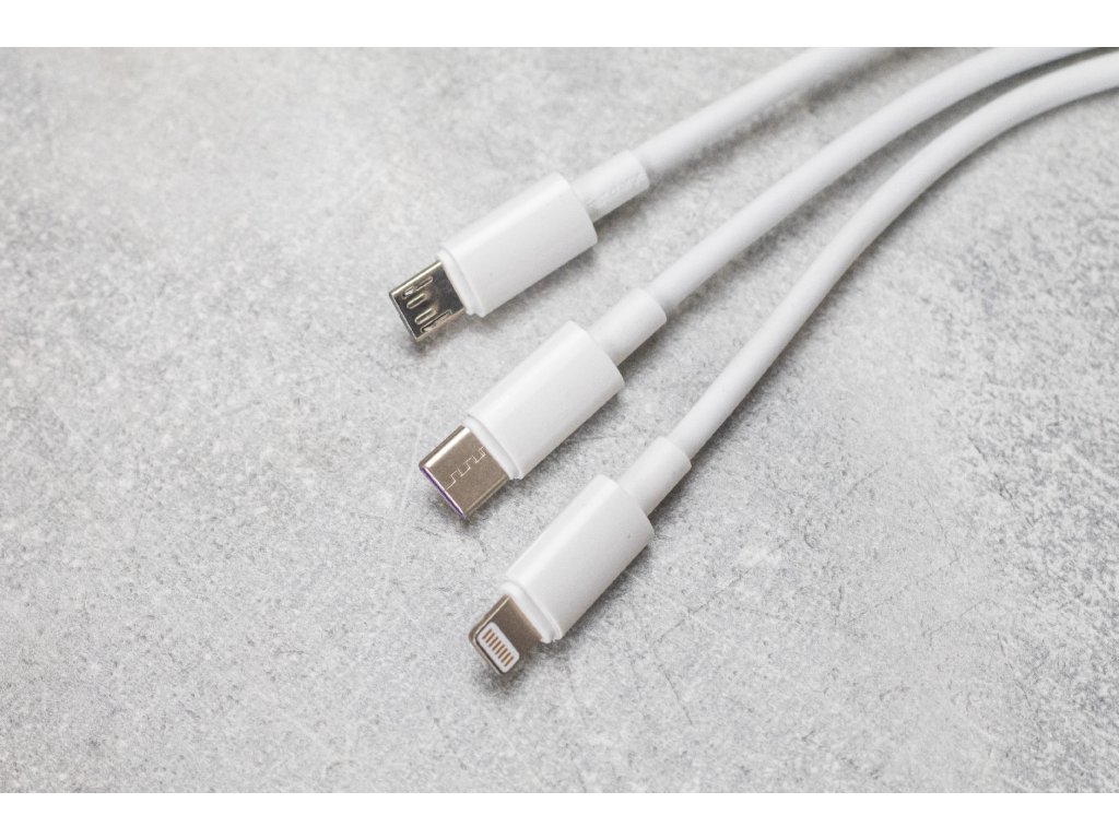 Nabíjecí kabel se třemi konektory (Lightning, USB-C, microUSB). Délka kabelu 1m.