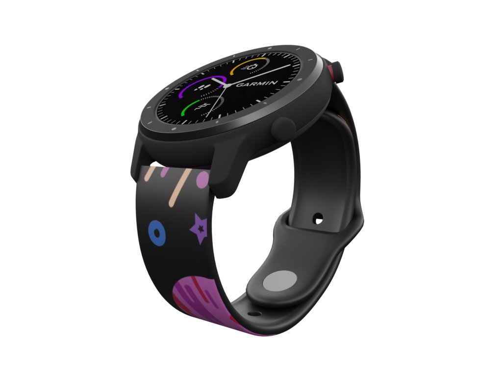 Černý náhradní řemínek pro chytré hodinky s potiskem vesmíru a růžové planety.