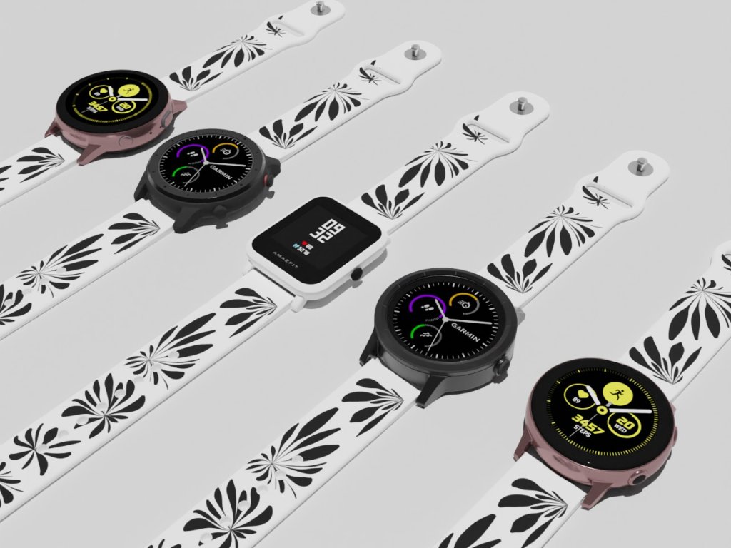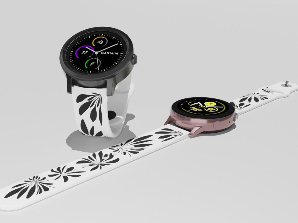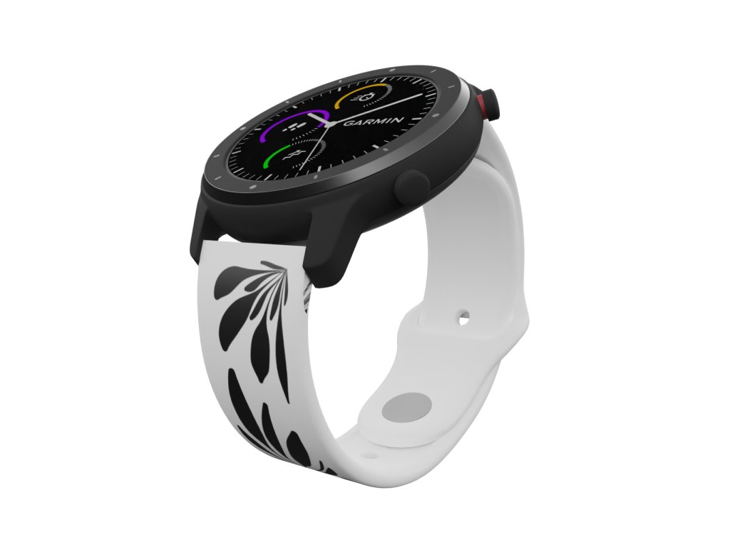 Bílý náhradní řemínek pro chytré hodinky s potiskem černých květů.