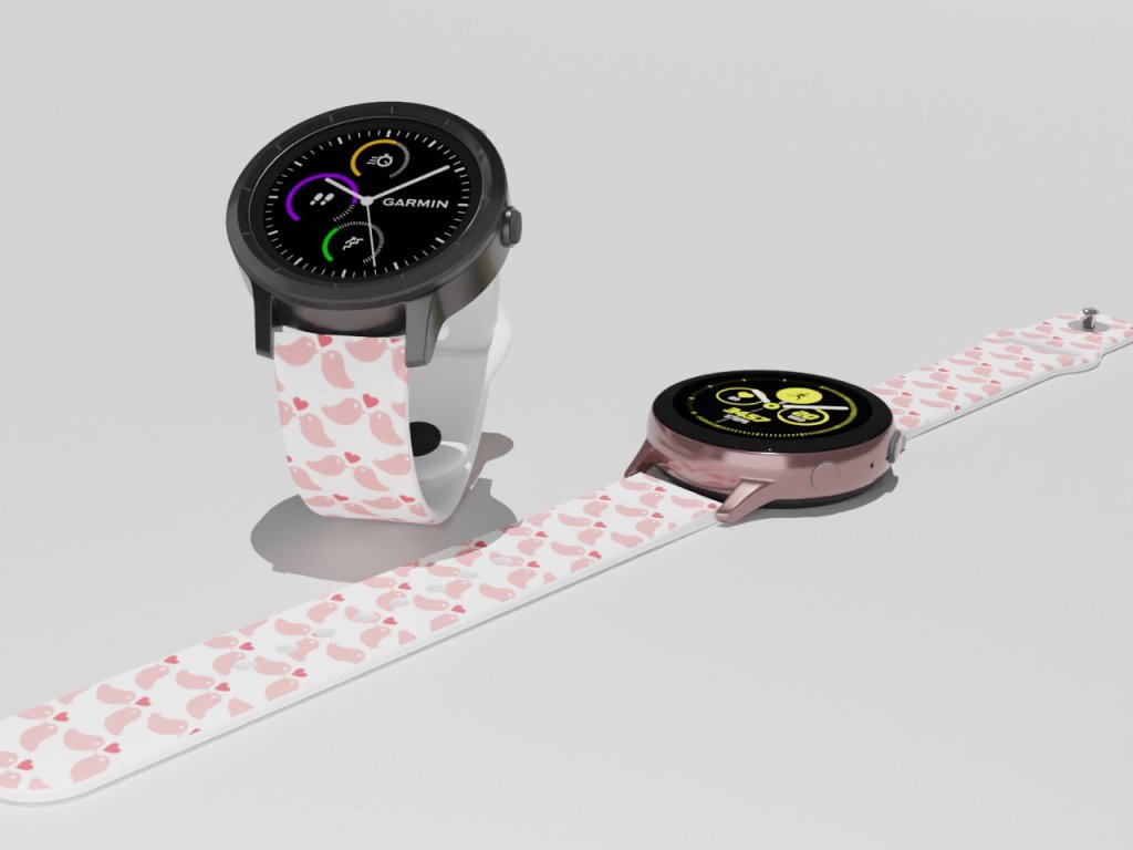 Bílý náhradní řemínek pro chytré hodinky s potiskem zamilovaných ptáčků se srdíčky.