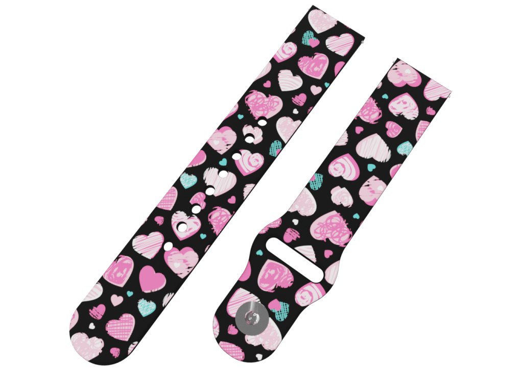 Černý náhradní řemínek s grafikou růžových a modrých srdíček. Vzplaňte láskou v tónech