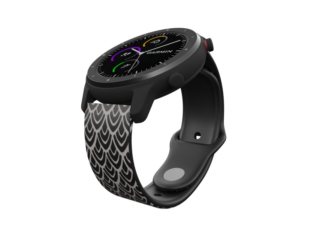 Černý náhradní řemínek pro chytré hodinky s potiskem rybích šupinek.