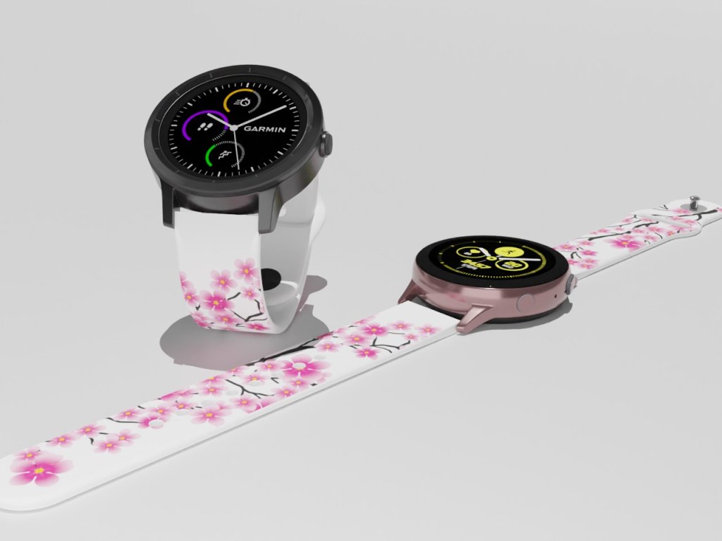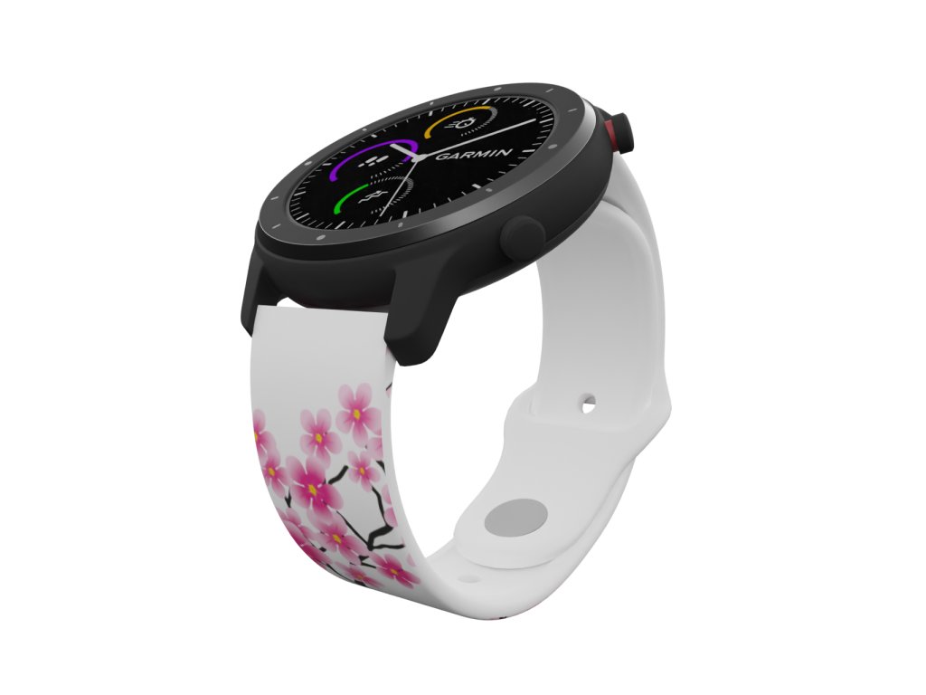 Bílý náhradní řemínek s růžovo-červenou grafikou větviček sakury. Jako růžové chomáčky