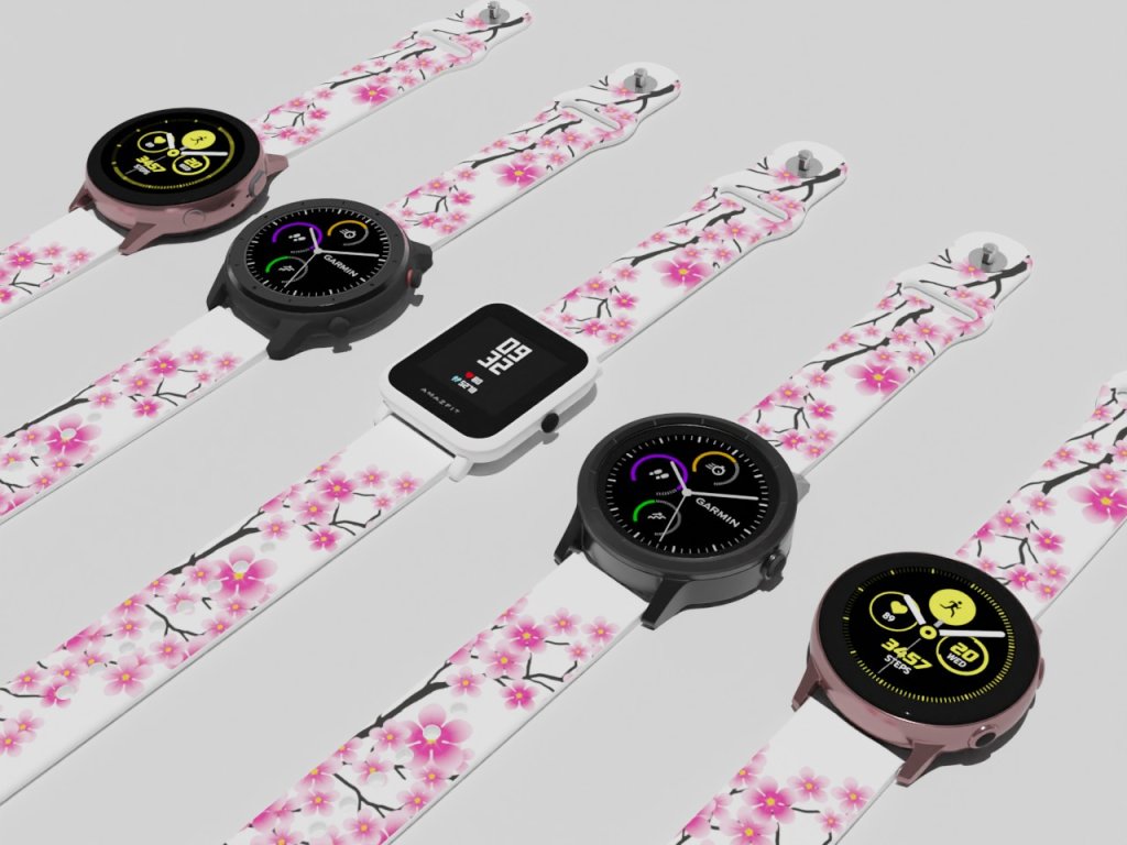 Bílý náhradní řemínek s růžovo-červenou grafikou větviček sakury. Jako růžové chomáčky