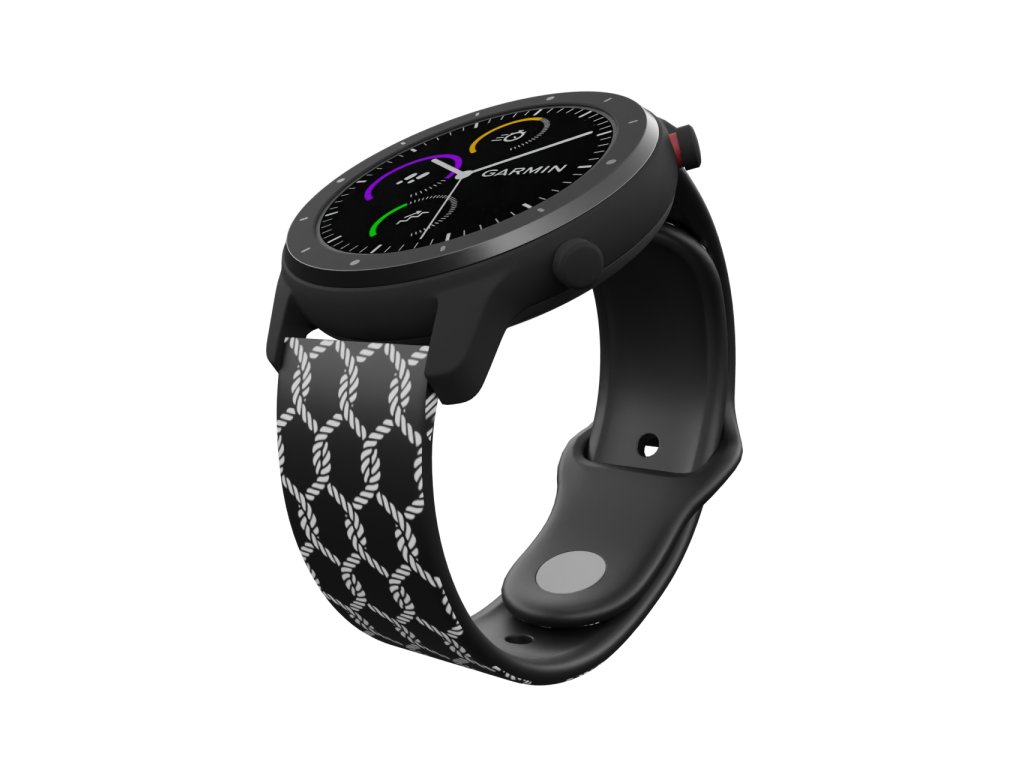Černý náhradní řemínek pro chytré hodinky s potiskem bílé sítě.