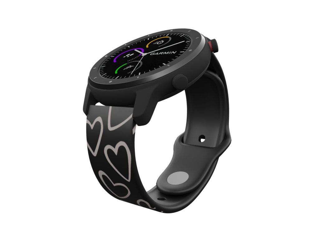 Černý náhradní řemínek pro chytré hodinky s potiskem bílých srdcí.