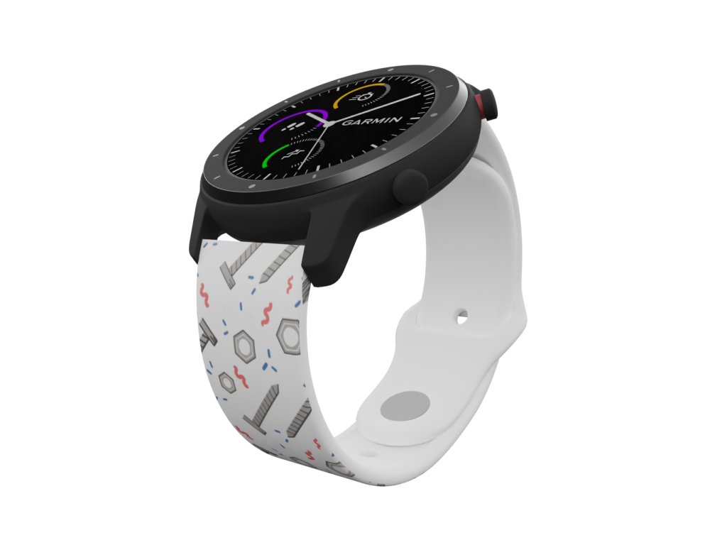 Bílý náhradní řemínek pro chytré hodinky s potiskem šroubků.