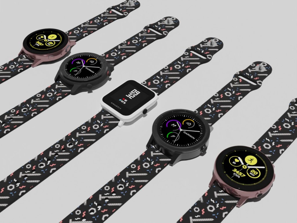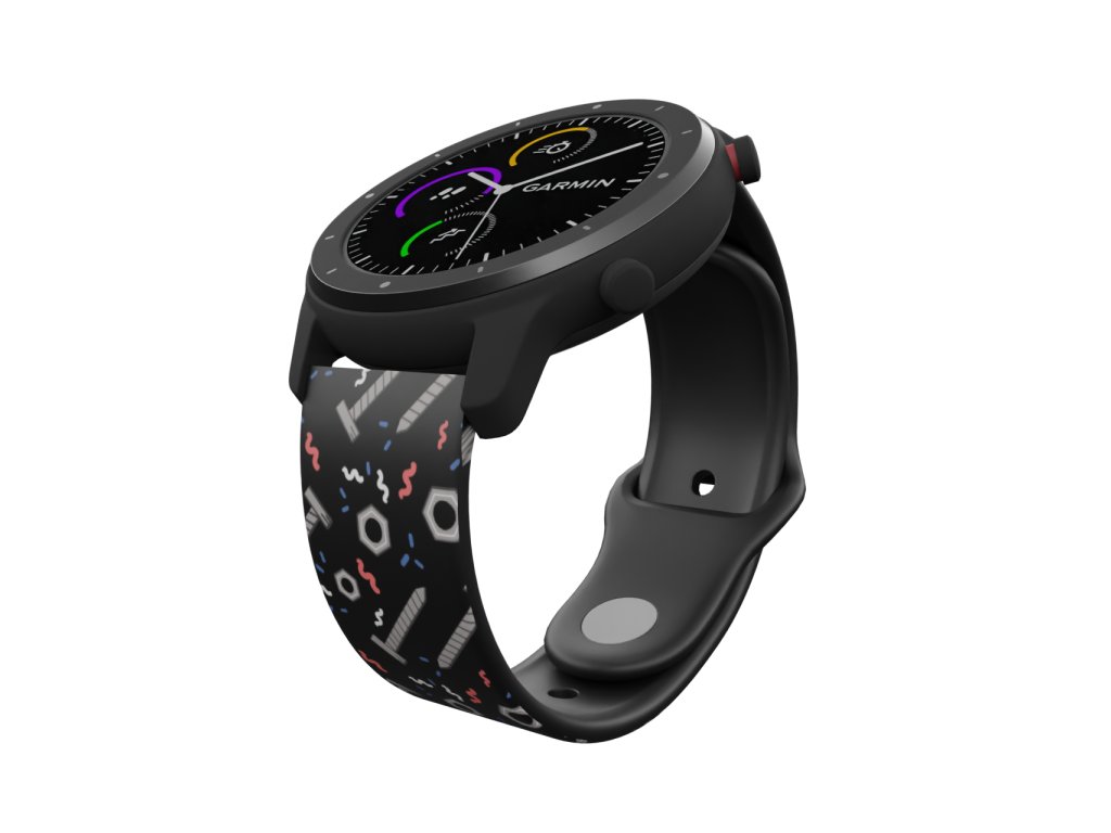 Černý náhradní řemínek pro chytré hodinky s potiskem šroubků.