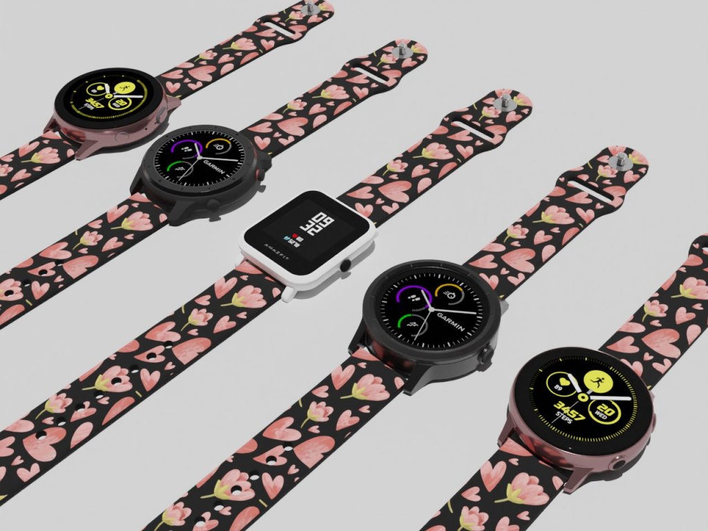 Černý náhradní řemínek pro chytré hodinky s potiskem malovaných kytiček a srdíček
