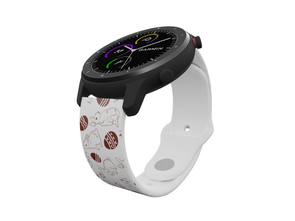 Bílý náhradní řemínek pro chytré hodinky s potiskem prvků Velikonoc v hnědé barvě.